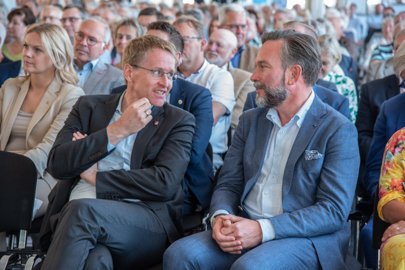 Haus & Grund Kiel wird in diesem Jahr 150 Jahre alt. Haus & Grund Schleswig-Holstein und die Norddeutsche Hausbesitzer Zeitung blicken auf 125 Jahre zurück. Diese Jubiläen feierte Haus & Grund unter dem Motto „Perspektive Eigentum“ am 8. Juli 2023 in Kiel-Schilksee mit zahlreichen Ehrengästen, unter anderem der Landtagspräsidentin Kristina Herbst, dem Ministerpräsidenten Daniel Günther, dem Kieler Oberbürgermeister Dr. Ulf Kämpfer, dem Präsidenten des Zentralverbandes Haus & Grund Deutschland Dr. Kai Warnecke und der Grünen Bundestagsabgeordneten Dr. Ingrid Nestle. Per Schiff ging es für einen nennenswerten Teil der Mitglieder bei strahlendem Sonnenschein über die Kieler Förde zum Veranstaltungsort der Kundgebung. Dort spielte die Michael Weiss Jazzband bereits groß auf. Nach einer kulinarischen Stärkung sorgte die Journalistin Eva Diederich mit ihrer durchweg herzlichen Art und zeitweise kernigen Moderation für gute Laune. Die jeweiligen Gesprächsduos auf der Bühne hatte sie zu jedem Zeitpunkt bestens im Griff.